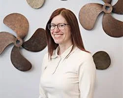 In this image, Sheila is wearing a white shirt and smiling. The background is of boat propellers.