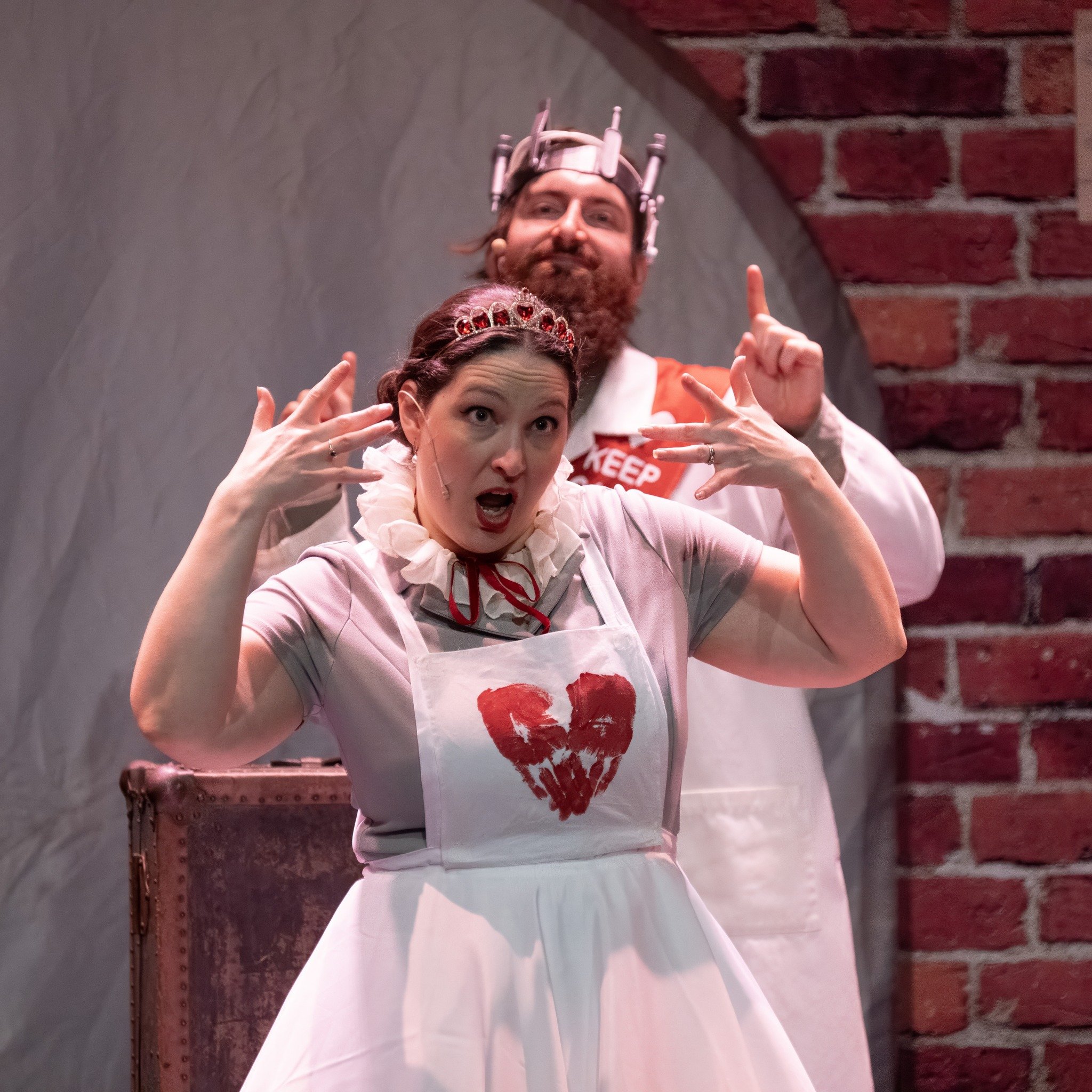 Image of Sam in play “Alice at Heart’. She is wearing a white nurses apron with a red heart on the front. She is singing in this image.